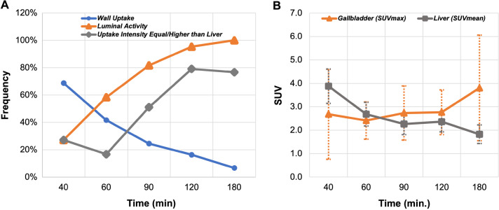 Results: All 73 subjects showed GB uptake at one or more imaging timepoints. An increase in uptake intensity overtime was observed up until the 180-min scan, and the visualization rate of GB 18F-FDG uptake was 100% in the 120- and 180-min post-injection scans. GB wall uptake was detected in a significant number of patients (44/73, 60%), especially at early timepoint scans, whereas luminal activity was detected in 71/73 (97%) subjects, especially at later timepoint scans. No significant correlation was found between GB uptake intensity/pattern and subjects' characteristics.