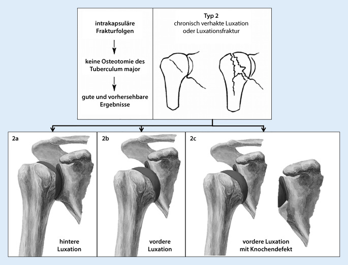 Die chronisch verhakte Luxation des Glenohumeralgelenks ist eine seltene, oft schmerzhafte Schulterpathologie, die mit ausgeprägten Bewegungseinschränkungen in der Schulter einhergehen kann. Bei Patienten im fortgeschrittenen Alter wird als operative Therapiemöglichkeit zunehmend die Endoprothese eingesetzt. Präoperativ sollte die Luxationsrichtung, das Vorliegen und die Ausprägung eines Glenoiddefekts sowie die Weichteilsituation (Rotatorenmanschettenstatus, Gelenkkapsel) differenziert analysiert werden. Anhand der genannten Faktoren empfehlen wir eine Subklassifikation der Frakturfolgen Typ 2 nach Boileau: verhakte hintere Luxation (2a), verhakte vordere Luxation ohne Glenoiddefekt (2b) und verhakte vordere Luxation mit Glenoiddefekt (2c). Bei dorsal verhakten Luxationen können mittels anatomischer Endoprothese gute klinische Ergebnisse erzielt werden. Für ventral verhakte Luxationen empfehlen wir die Implantation einer inversen Totalendoprothese mit gegebenenfalls knöcherner Glenoidrekonstruktion und Transfer des M. pectoralis major.