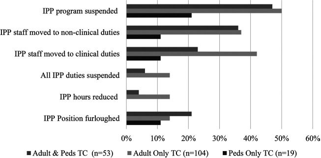 Results: A total of 216 participants affiliated with 227 trauma centers responded. The following changes were reported during 2020: change in injury prevention position (range = 31%-88%); change in duties (range = 92%-100%); and change to hospital-based injury prevention programs (range = 75%-100%). Sixty-one (43%) single-center participants with a registered nurse license were reassigned to clinical duties compared with six (10%) nonlicensed participants (OR = 5.6; 95% CI [1.96, 13.57]; p < .001). Injury prevention programs at adult-only and combined adult and pediatric trauma centers had higher odds of suspension than pediatric-only trauma centers (OR = 3.6; 95% CI [1.26, 10.65]; p < .017).