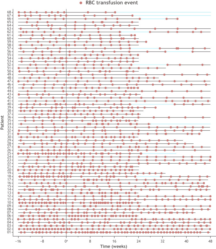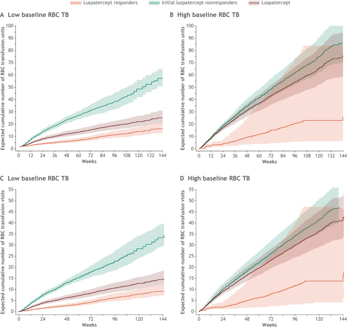 Red blood cell transfusion independence (RBC-TI) is an important goal in treating lower-risk myelodysplastic syndromes with ring sideroblasts. In the phase 3 MEDALIST study, RBC-TI of ≥ 8 weeks was achieved by significantly more luspatercept- versus placebo-treated patients in the first 24 weeks of treatment. In this post hoc analysis, we evaluated RBC transfusion units and visits based on patients' baseline transfusion burden level and the clinical benefit of luspatercept treatment beyond week 25 in initial luspatercept nonresponders (patients who did not achieve RBC-TI ≥ 8 weeks by week 25) but continued luspatercept up to 144 weeks. RBC transfusion burden, erythroid response, serum ferritin levels, and hemoglobin levels relative to baseline were evaluated. Through week 25, fewer RBC transfusion units and visits were observed in luspatercept-treated patients versus placebo, regardless of baseline transfusion burden. This continued through 144 weeks of luspatercept treatment, particularly in patients with low baseline transfusion burden. Sixty-eight patients were initial nonresponders at week 25 but continued treatment; most (81%) received the maximum dose of luspatercept (1.75 mg/kg). Sixteen percent achieved RBC-TI for ≥ 8 weeks during weeks 25-48, 26% had reduced RBC transfusion burden, 10% achieved an erythroid response, 44% had reduced serum ferritin, and hemoglobin levels increased an average of 1.3 g/dL from baseline. These data have implications for clinical practice, as transfusion units and visits are less in luspatercept-treated patients through week 25 regardless of baseline transfusion burden, and continuing luspatercept beyond week 25 can potentially provide additional clinical benefits for initial nonresponders. Trial registration: NCT02631070.