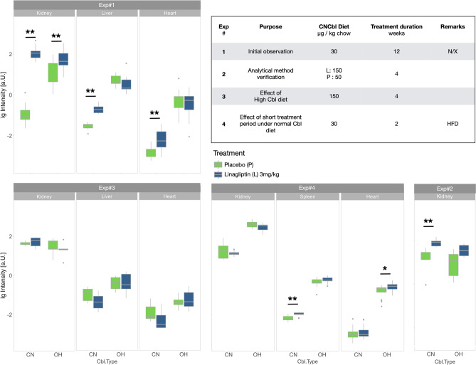 Linagliptin is a dipeptidyl peptidase-4 (DPP-4) inhibitor used for the treatment of type 2 diabetes, with additional beneficial effects for the kidney. Treatment of mice with linagliptin revealed increased storage of cobalamin (Cbl, Vitamin B12) in organs if a standard Cbl diet (30 µg Cbl/kg chow) is given. In order to translate these findings to humans, we determined methylmalonic acid (MMA), a surrogate marker of functional Cbl homeostasis, in human plasma and urine samples (n = 1092) from baseline and end of trial (6 months after baseline) of the previously completed MARLINA-T2D clinical trial. We found that individuals with medium Cbl levels (MMA between 50 and 270 nmol/L for plasma, 0.4 and 3.5 µmol/mmol creatinine for urine, at baseline and end of trial) exhibited higher MMA values at the end of study in placebo compared with linagliptin. Linagliptin might inhibit the N-terminal degradation of the transcobalamin receptor CD320, which is necessary for uptake of Cbl into endothelial cells. Because we demonstrate that linagliptin led to increased organ levels of Cbl in mice, sustained constant medium MMA levels in humans, and inhibited CD320 processing by DPP-4 in-vitro, we speculate that linagliptin promotes intra-cellular uptake of Cbl by prolonging half-life of CD320.