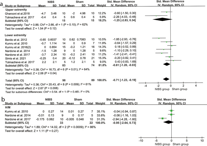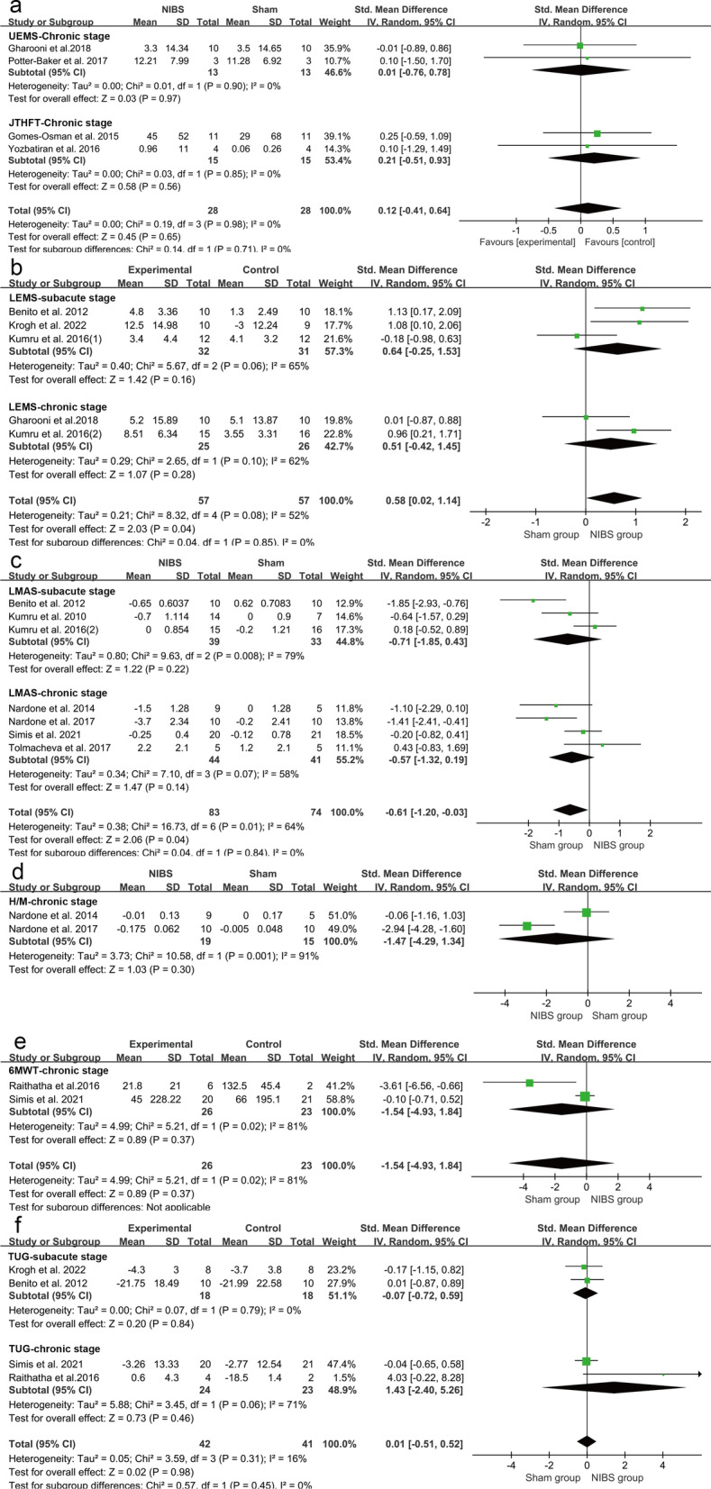 Results: A total of 14 randomized control trials involving 225 participants were included. Nine studies used repetitive transcranial magnetic stimulation (rTMS) and five studies used transcranial direct current stimulation (tDCS). The meta-analysis showed that NIBS could improve the lower extremity strength (SMD = 0.58, 95% CI = 0.02-1.14, P = 0.004), balance (SMD = 0.64, 95% CI = 0.05-1.24, P = 0.03), and decrease the spasticity (SMD = - 0.64, 95% CI = - 1.20 to - 0.03, P = 0.04). However, the motor ability of the upper extremity in the NIBS groups was not statistically significant compared with those in the control groups (upper-extremity strength: P = 0.97; function: P = 0.56; and spasticity: P = 0.12). The functional mobility in the NIBS groups did not reach statistical significance when compared with the sham NIBS groups (sham groups). Only one patient reported seizures that occurred during stimulation, and no other types of serious adverse events were reported.