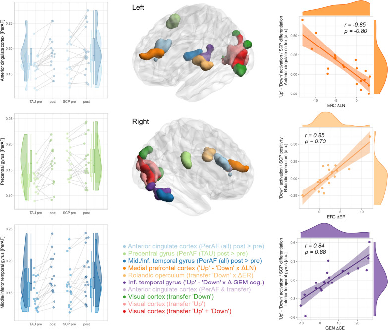 Results: No significant treatment group-by-time interactions in affective or resting-state measures were found. However, we found increases of resting activity in the anterior cingulate cortex and right inferior temporal gyrus as well as improvements in affective characteristics over both groups. Activation corresponding to SCP differentiation in these regions correlated with the affective improvements. A further correlation was found for Rolandic operculum activation corresponding to positive SCP shifts. There were no significant correlations with the respective achieved SCP regulation during NF training.