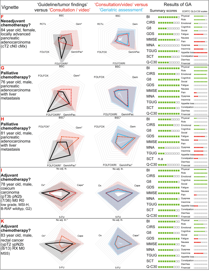 Materials and methods: Seventy oncologists gave their medical treatment recommendations for a maximum of 4 out of 10 gastrointestinal cancer patients in three steps: (i) based on tumor findings alone to simulate the guideline recommendation for a '50-year-old standard patient without comorbidities'; (ii) for the same situation in elderly patients (median age 77.5 years) according to the comorbidities, laboratory values and a short video simulating the clinical consultation; and (iii) after the results of a full GA including interpretation aid [Barthel Index, Cumulative Illness Rating Scale (CIRS), Geriatric 8 (G8), Geriatric Depression Scale (GDS), Mini Mental Status Examination (MMSE), Mini-Nutritional Assessment (MNA), Timed Get Up and Go (TGUG), European Organisation for Research and Treatment of Cancer Quality of Life Questionnaire-30 (EORTC QLQ-C30), stair climb test].