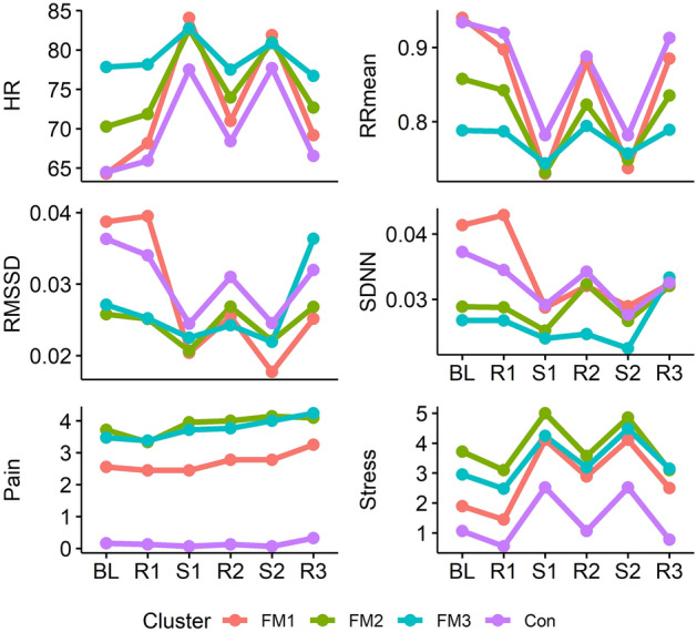 Fibromyalgia (FM) is associated with sympathetically dominant dysautonomia, but the connection between dysautonomia and FM symptoms is unclear. Dysautonomia can be analysed with heart rate variability (HRV) and it has been proposed that FM patients comprise subgroups with differing profiles of symptom severity. In our study, 51 female FM patients aged 18 to 65 years and 31 age-matched healthy female controls followed a 20-min protocol of alternating relaxation and cognitive stress (mental arithmetic). Heart rates and electrocardiograms were registered. The HRV measures of heart rate (HR), mean interval between heart beats (RRmean), root mean squared interval differences of successive beats (RMSSD), and the standard deviation of intervals between normal heart beats (SDNN) were analysed with generalized linear modelling. Features in HRV reactivity which differed between FM patients and controls were used to cluster the FM patients and cluster characteristics were analysed. FM patients had higher baseline HR (72.3 [SD 12.7] vs 64.5 [7.80], p < 0.001) and lower RRmean (0.844 [0.134] vs 0.934 [0.118], p = 0.002), compared with controls. They also reacted to repeated cognitive stress with an attenuated rise in HR (- 4.41 [95% CI - 7.88 to - 0.93], p = 0.013) and attenuated decrease of RRmean (0.06 [95 CI 0.03 to 0.09], p < 0.001), compared with controls. Clustering of FM patients by HRV reactivity resulted in three clusters characterised by (1) normal levels of HRV and HRV reactivity with low levels of depressive mood and anxiety, (2) reduced levels of HRV and impaired HRV reactivity with increased levels of depressive mood and high levels of anxiety, and (3) lowest HRV and most impaired HRV reactivity with the highest scores for depressive mood and anxiety. Our results show that FM patients have lower HRV than healthy controls and their autonomous reactions to cognitive stress are attenuated. Dysautonomia in FM associates with mood disturbance. Trial registration ClinicalTrials.gov (NCT03300635). Registered October 3 2017-Retrospectively registered, https://clinicaltrials.gov/ct2/show/NCT03300635 .