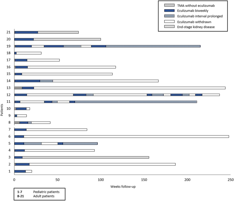 Results: A total of 21 patients were included in the study from January 2016 to October 2020. In 17 patients (81%), a complement genetic variant or antibodies against factor H were identified. All patients showed full recovery of hematological thrombotic microangiopathy (TMA) parameters after the start of eculizumab. A renal response was noted in 18 patients. After a median treatment duration of 13.6 weeks (range 2.1-43.9), eculizumab was withdrawn in all patients. During follow-up (80.7 weeks [0.0-236.9]), relapses occurred in 4 patients. Median time to first relapse was 19.5 (14.3-53.6) weeks. Eculizumab was reinitiated within 24 hours in all relapsing patients. At last follow-up, there were no chronic sequelae, i.e., no clinically relevant increase in serum creatinine (sCr), proteinuria, and/or hypertension in relapsing patients. The low sample size and event rate did not allow to determine predictors of relapse. However, relapses only occurred in patients with a likely pathogenic variant. The cost-effectiveness analysis revealed that the total medical expenses of our population were only 30% of the fictive expenses that would have been made when patients received eculizumab every fortnight.