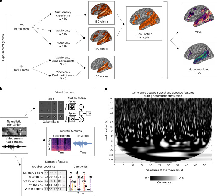 The processing of multisensory information is based upon the capacity of brain regions, such as the superior temporal cortex, to combine information across modalities. However, it is still unclear whether the representation of coherent auditory and visual events requires any prior audiovisual experience to develop and function. Here we measured brain synchronization during the presentation of an audiovisual, audio-only or video-only version of the same narrative in distinct groups of sensory-deprived (congenitally blind and deaf) and typically developed individuals. Intersubject correlation analysis revealed that the superior temporal cortex was synchronized across auditory and visual conditions, even in sensory-deprived individuals who lack any audiovisual experience. This synchronization was primarily mediated by low-level perceptual features, and relied on a similar modality-independent topographical organization of slow temporal dynamics. The human superior temporal cortex is naturally endowed with a functional scaffolding to yield a common representation across multisensory events.
