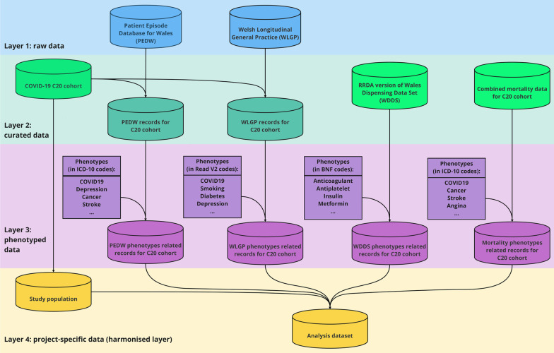 Results: Using the implemented four-layer harmonisation method, we retrieved approximately 100 health-related variables for the 3.2 million individuals in Wales, which are harmonised with corresponding variables for > 56 million individuals in England. We processed 13 data sources into the first layer of our harmonisation method: five of these are updated daily or weekly, and the rest at various frequencies providing sufficient data flow updates for frequent capturing of up-to-date demographic, administrative and clinical information.