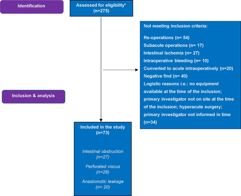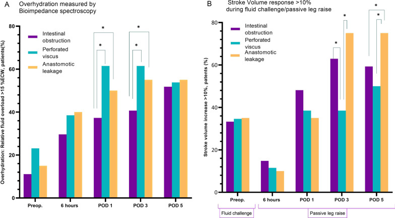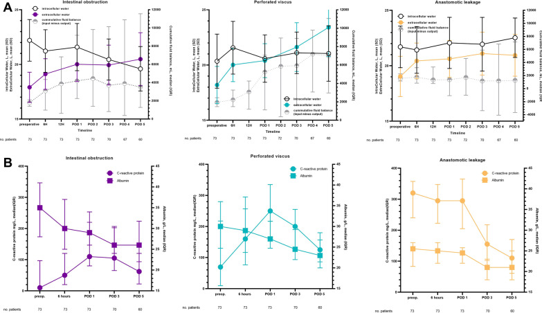 Methods: Seventy-three patients undergoing surgery for intestinal obstruction, perforated viscus, and anastomotic leakage within a well-defined perioperative regime, including intraoperative goal-directed therapy, were included in this prospective, observational study. From 0 to 120 h, we measured body fluid volumes and hydration status by bioimpedance spectroscopy (BIA), fluid balance (input vs. output), preload dependency defined as a > 10% increase in stroke volume after preoperative fluid challenge, and post-operatively evaluated by passive leg raise.