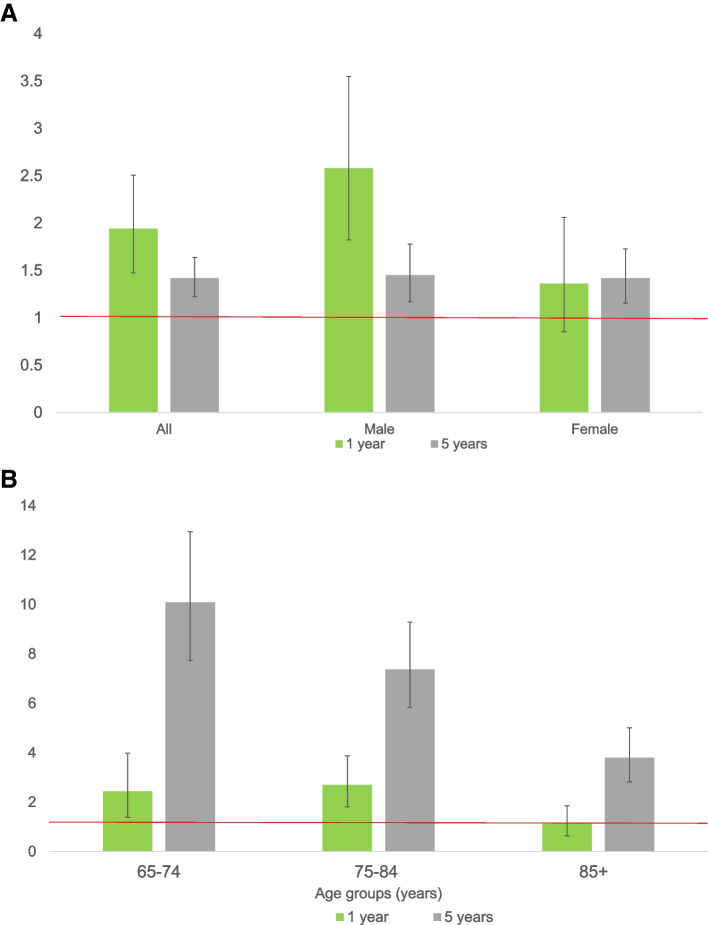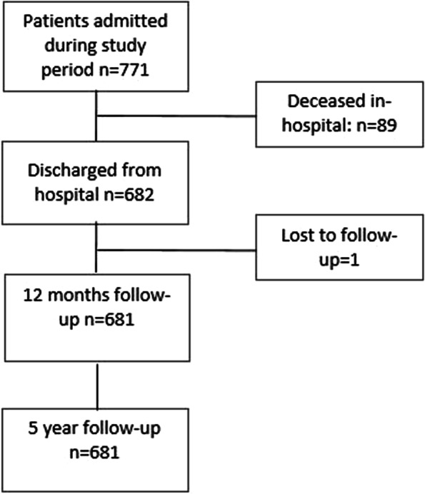 Results: In total, 682/771 admitted patients were discharged. One-year and five-year mortality rates were 8.1 and 23.4%. The SMRs were 1.9(95%CI 1.5-2.5) and 1.4(95%CI 1.2-1.6), respectively. The SMRs were highest in patients aged 75-80 years at 1 year (SMRs 2.7, 95%CI 1.82-3.87) and five-year in patients aged 65-74 years (SMRs 10.1, 95%CI 7.7-13.0). Independent predictors for mortality at 1 year after discharge were higher age (OR 1.1, 95%CI 1.0-1.1), severe comorbidity, (ASA-score ≥ 3) (OR 4.8, 95%CI 2.3-9.7), and a non-home discharge location (OR 2.0, 95%CI 1.1-3.8). The relative risk of dying up to five-year was increased by age (HR 1.1, 95%CI 1.0-1.1), severe comorbidity (HR 2.3, 95%CI 1.6-3.5), and non-home discharge location (HR 2.1, 95%CI 1.4-3.2).