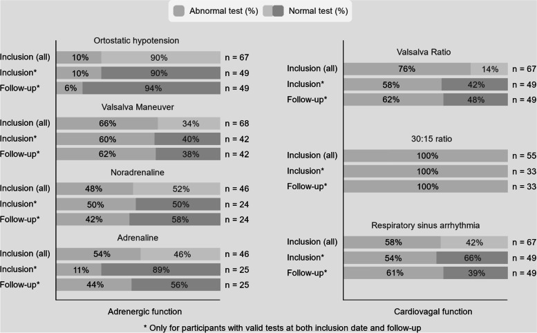 Results: The cohort was comprised of 91 acute stroke patients, mean (SD) age 66 (11) years, median (IQR) initial National Institute of Health Stroke Scale 2 (1-4) and modified Ranking Scale 2 (1-3). The head-up tilt table test revealed 7 patients (10%) with orthostatic hypotension. The examination was terminated before it was completed in 15%, but none developed neurological symptoms. In the acute state the prevalence of autonomic dysfunction varied between 10-100% depending on the test. No changes were found in presence and severity of autonomic dysfunction over time.