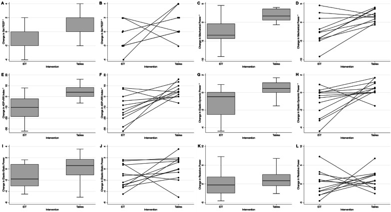 Results: EIT was consistently associated with a decrease in mechanical power compared to PEEP/FiO2 tables (mean difference - 4.36 J/min, 95% CI - 6.7, - 1.95, p = 0.002) and led to lower values in the 4ΔP + RR index (- 11.42 J/min, 95% CI - 19.01, - 3.82, p = 0.007) mainly driven by a decrease in the elastic-dynamic power (- 1.61 J/min, - 2.99, - 0.22, p = 0.027). The elastic-static and resistive powers were unchanged. Similarly, EIT led to a statistically significant change in set PEEP (- 2 cmH2O, p = 0.046), driving pressure, (- 2.92 cmH2O, p = 0.003), peak pressure (- 6.25 cmH2O, p = 0.003), plateau pressure (- 4.53 cmH2O, p = 0.006), and static respiratory system compliance (+ 7.93 ml/cmH2O, p = 0.008).