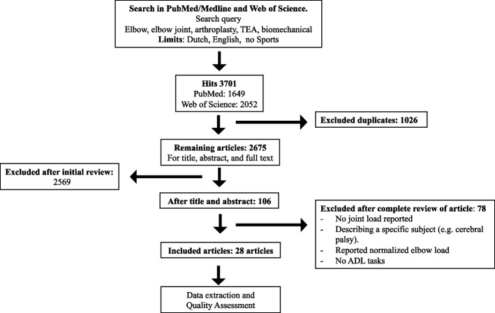 Methods: A scoping review of studies until 23 November 2021 investigating elbow joint load during ADL were identified by searching PubMed/Medline and Web of Science. Studies were eligible when: (1) reporting on the elbow joint load in native elbows or elbows with an elbow arthroplasty in adults; (2) full-text article was available.