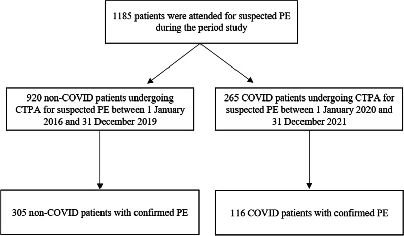 Results: We analyzed 116 (27.5%) COVID patients and 305 (72.4%) non-COVID patients. In patients with COVID-19, the traditional risk factors for PE were absent, and the incidence of deep vein thrombosis was lower. COVID patients showed significantly higher lymphocyte count, lactate dehydrogenase, lactic acid, and D-dimer levels. COVID patients had PE of smaller size (12.3% vs. 25.5% main pulmonary artery, 29.8% vs. 37.1% lobar, 44.7% vs. 29.5% segmental and 13.2% vs. 7.9% subsegmental, respectively; p < 0.001), less right ventricular dysfunction (7.7% vs. 17.7%; p = 0.007) and higher sPESI score (1.66 vs. 1.11; p < 0.001). The need for mechanical ventilation was significantly higher in COVID patients (8.6% vs. 1.3%; p < 0.001); However, the in-hospital death was less (5.2% vs. 10.8%; p = 0.074). The incidence of long-term complications was lower in COVID cohort (p < 0.001). PE severity assessed by high sPESI and intermediate and high-risk categories were independently associated with in-hospital mortality in COVID patients.