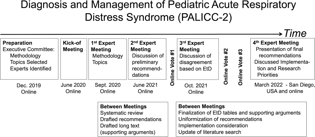 Objectives: This article describes the methodology used for The Second Pediatric Acute Lung Injury Consensus Conference (PALICC-2). The PALLIC-2 sought to develop evidence-based clinical recommendations and when evidence was lacking, expert-based consensus statements and research priorities for the diagnosis and management of pediatric acute respiratory distress syndrome (PARDS).
