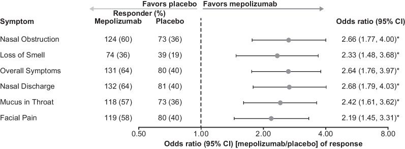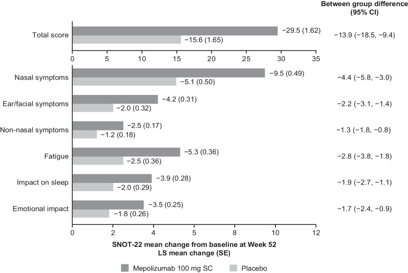 Conclusions: Symptoms VAS and SNOT-22 had acceptable psychometric properties for use in very severe CRSwNP. Mepolizumab provided meaningful within-patient improvements in symptom severity and health-related quality of life versus placebo, indicating mepolizumab provides substantial clinical benefits in very severe CRSwNP.