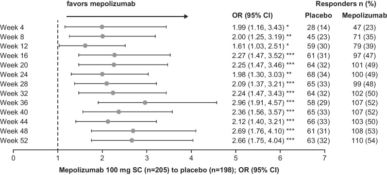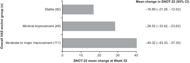 Results: Internal consistency was acceptable for VAS and SNOT-22 scores (Cronbach's α-coefficients ≥ 0.70). Test-retest reliability was demonstrated for all symptom VAS (Intra-Class Correlation coefficients > 0.75). Construct validity was acceptable between individual and composite VAS and SNOT-22 total score (r = 0.461-0.598) and between individual symptom VAS and corresponding SNOT-22 items (r = 0.560-0.780), based upon pre-specified ranges. Known-groups validity assessment demonstrated generally acceptable validity based on factors associated with respiratory health, with all VAS responsive to change. Mepolizumab treatment was associated with significantly increased odds of meeting or exceeding meaningful within-patient change thresholds, derived for this very severe cohort using six anchor groups for individual VAS (odds ratio [OR] 2.19-2.68) at Weeks 49-52, and SNOT-22 (OR 1.61-2.96) throughout the study.