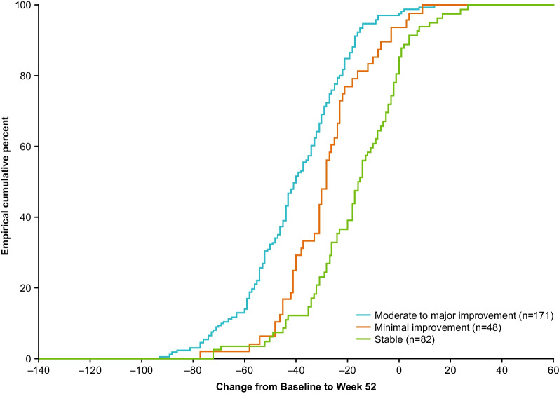 Methods: SYNAPSE (NCT03085797), a randomized, double-blind, placebo-controlled, 52-week trial, assessed the efficacy and safety of 4-weekly mepolizumab 100 mg subcutaneously added to standard of care in very severe CRSwNP. Enrolled patients (n = 407) completed symptom VAS (six items) daily and SNOT-22 every 4 weeks from baseline until Week 52. Blinded psychometric assessment of individual and composite VAS was performed post hoc, including anchor-based thresholds for meaningful within-patient changes for VAS and SNOT-22, supported by cumulative distribution function and probability density function plots. The effect of mepolizumab versus placebo for 52 weeks on VAS and SNOT-22 scores was then determined using these thresholds using unblinded data.