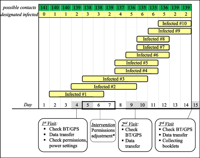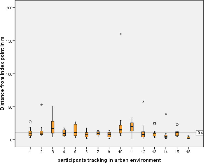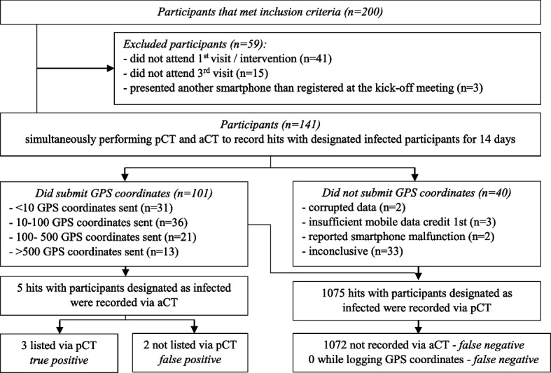 Results: GPS coordinates from 101/141 (71.6%) participants were received. The number of hours recorded by the participants during the study period, true Hours Recorded (tHR), was 496.3 h (1.1% of maximum Hours recordable) during the study period. With the paper-based method 1075 hits and with the DCT app five hits of designated infected participants with other participants have been listed. Differences between true and maximum recording times were due to failed permission settings (45%), data transmission issues (11.3%), of the participants 10.1% switched off GPS and 32.5% experienced other technical or compliance problems. In buildings, use of Bluetooth increased the accuracy of the DCT app (GPS + BT 22.9 m ± 21.6 SD vs. GPS 60.9 m ± 34.7 SD; p = 0.004). GPS accuracy in public transportation was 10.3 m ± 10.05 SD with a significant (p = 0.007) correlation between precision and phone brand. GPS resolution outdoors was 10.4 m ± 4.2 SD.