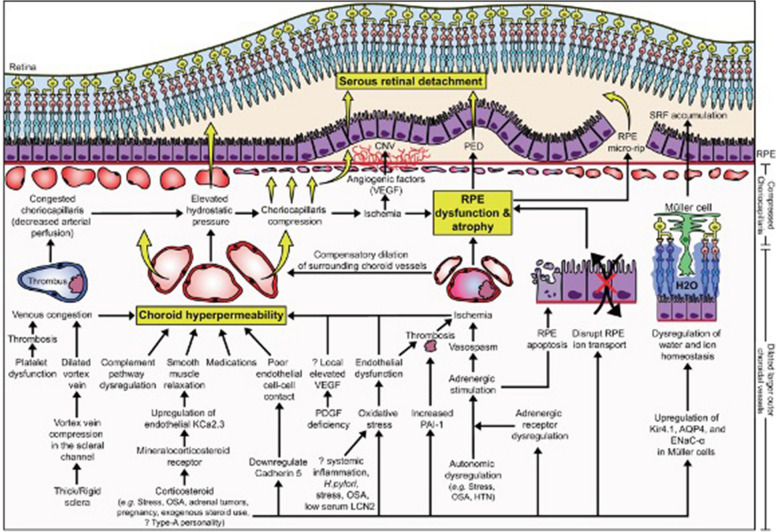 Main body: The concept of the pachychoroid disease spectrum and pachychoroid-driven processes are central to current theories regarding the pathophysiological underpinnings of CSCR. Choroidal hyperpermeability and subsequent leakage of fluid seen in CSCR may be due to several causes. Among them are venous congestion, inflammation, mineralocorticoid receptor activation, systemic factors including hemodynamic changes, obstructive sleep apnea, phosphodiesterase inhibitor use, pregnancy, and genetic predispositions. Congestion of vortex veins that drain blood from the choroid may contribute to the dilation of Haller vessels and cause fluid leakage. Vortex veins exit the eye through the sclera; thus, increased scleral thickness has been proposed to be a factor in venous congestion. Asymmetric vortex vein drainage may similarly result in congestion of the local venous system. Vortex vein anastomoses may overload the venous system and form secondary to venous congestion. Recent studies suggest inflammation and mineralocorticoid activation may factor into the development of CSCR, though more research in these areas is called for. Systemic conditions and genetics may predispose individuals to develop CSCR.