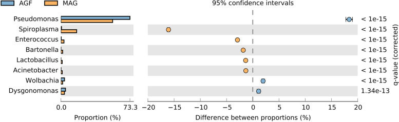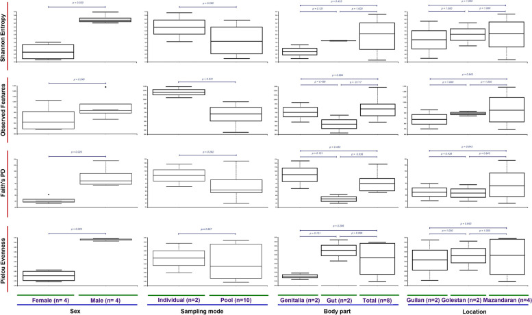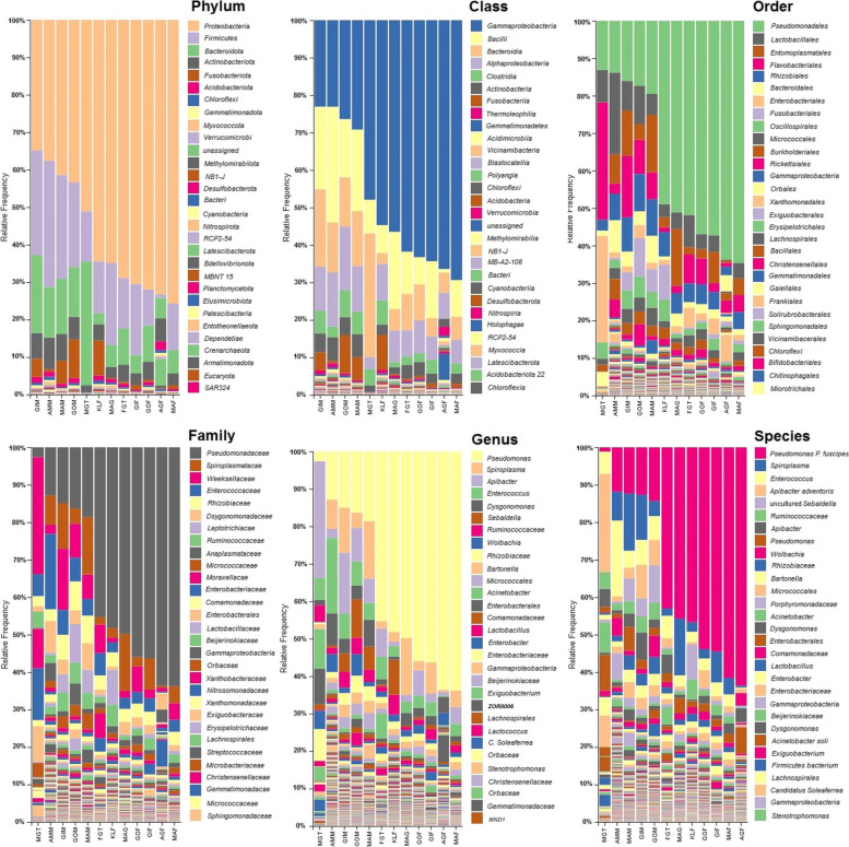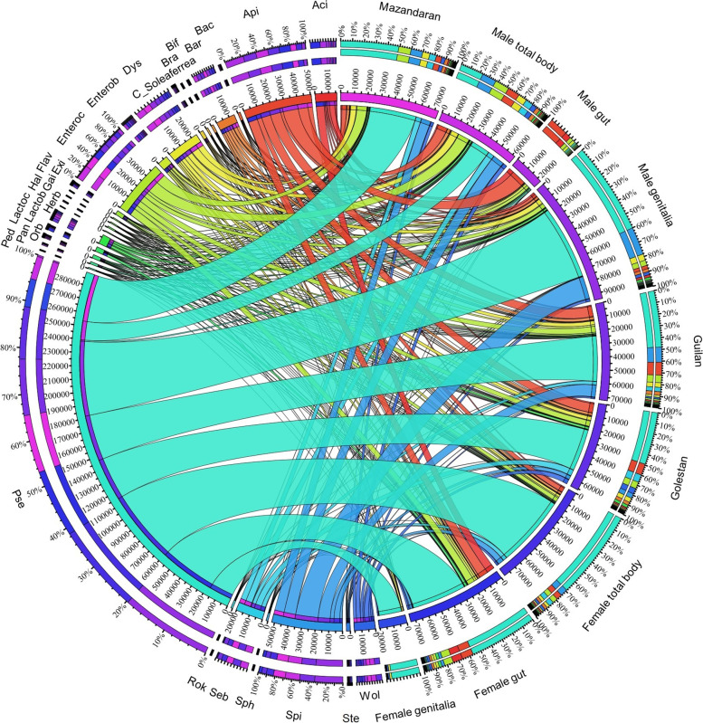 Results: The OTUs identified from P. fuscipes specimens were collapsed into 40 phyla, 112 classes, 249 orders, 365 families, 576 genera, and 106 species. The most abundant families were Pseudomonadaceae, Spiroplasmataceae, Weeksellaceae, Enterococcaceae, and Rhizobiaceae, respectively. Thirty top genera made up > 94% of the P. fuscipes microbiome, with predominating Pseudomonas, followed by the Spiroplasma, Apibacter, Enterococcus, Dysgonomonas, Sebaldella, Ruminococcus, and Wolbachia. Interesting dissimilarities were also discovered within and between the beetle microbiomes in terms of genders and organs. Analyses showed that Spiroplasma / Apibacter as well as Pseudomonas / Pseudomonas were the most abundant in the genitals / intestines of male and female beetles, respectively. Bacterial richness did not display any significant difference in the three provinces but was higher in male beetles than in females and more in the genitals than intestines.