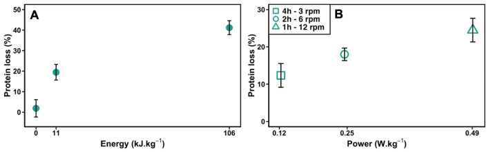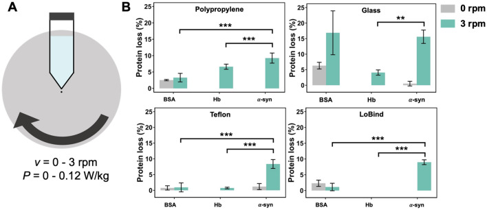 Protein aggregation in biotherapeutics can reduce their activity and effectiveness. It may also promote immune reactions responsible for severe adverse effects. The impact of plastic materials on protein destabilization is not totally understood. Here, we propose to deconvolve the effects of material surface, air/liquid interface, and agitation to decipher their respective role in protein destabilization and aggregation. We analyzed the effect of polypropylene, TEFLON, glass and LOBIND surfaces on the stability of purified proteins (bovine serum albumin, hemoglobin and α-synuclein) and on a cell extract composed of 6000 soluble proteins during agitation (P = 0.1-1.2 W/kg). Proteomic analysis revealed that chaperonins, intrinsically disordered proteins and ribosomes were more sensitive to the combined effects of material surfaces and agitation while small metabolic oligomers could be protected in the same conditions. Protein loss observations coupled to Raman microscopy, dynamic light scattering and proteomic allowed us to propose a mechanistic model of protein destabilization by plastics. Our results suggest that protein loss is not primarily due to the nucleation of small aggregates in solution, but to the destabilization of proteins exposed to material surfaces and their subsequent aggregation at the sheared air/liquid interface, an effect that cannot be prevented by using LOBIND tubes. A guidance can be established on how to minimize these adverse effects. Remove one of the components of this combined stress - material, air (even partially), or agitation - and proteins will be preserved.