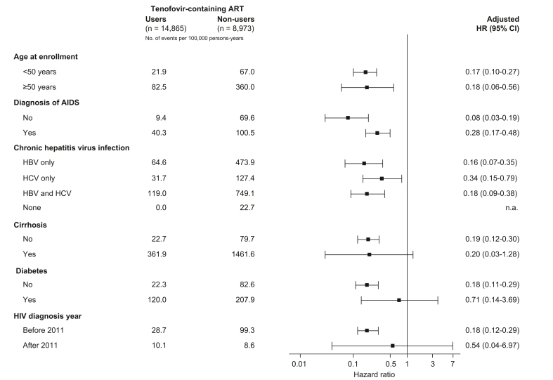 Results: HCC incidence was lower among ever users of tenofovir than among never users (24.2 and 85.7 per 100,000 person-years, respectively). Ever users had significantly reduced HCC risk (adjusted hazard ratio 0.20, 95% CI 0.13-0.31). The effect of tenofovir use on reduced risk for HCC consistently favored never users across many prespecified subgroups, including HBV or HCV coinfection (p <0.05). The findings were consistent in subgroups of PLWH diagnosed with HIV before tenofovir's approval and in those born before the nationwide roll-out of neonatal HBV vaccination.