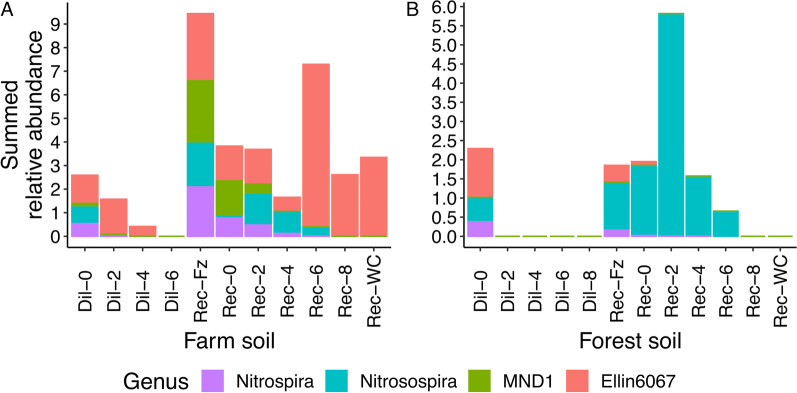 Background: Global biodiversity losses threaten ecosystem services and can impact important functional insurance in a changing world. Microbial diversity and function can become depleted in agricultural systems and attempts to rediversify agricultural soils rely on either targeted microbial introductions or retaining natural lands as biodiversity reservoirs. As many soil functions are provided by a combination of microbial taxa, rather than outsized impacts by single taxa, such functions may benefit more from diverse microbiome additions than additions of individual commercial strains. In this study, we measured the impact of soil microbial diversity loss and rediversification (i.e. rescue) on nitrification by quantifying ammonium and nitrate pools. We manipulated microbial assemblages in two distinct soil types, an agricultural and a forest soil, with a dilution-to-extinction approach and performed a microbiome rediversification experiment by re-introducing microorganisms lost from the dilution. A microbiome water control was included to act as a reference point. We assessed disruption and potential restoration of (1) nitrification, (2) bacterial and fungal composition through 16S rRNA gene and fungal ITS amplicon sequencing and (3) functional genes through shotgun metagenomic sequencing on a subset of samples.