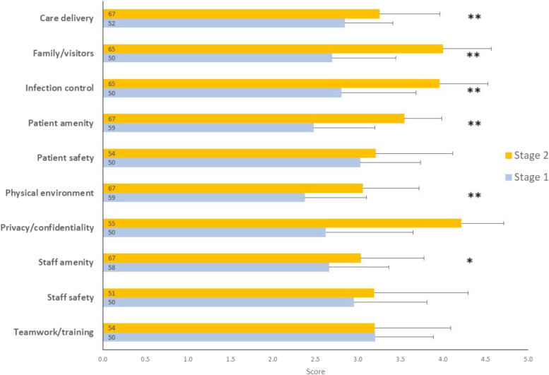 Background: There is sufficient and consistent international evidence of issues reported by nurses working in single-bed room environments, requiring a design that is not only comfortable for patients but meets nurses working needs. This paper presents a comparison of nursing staff and patients experience prior to a move to 100% single-bed room hospital in 2016 (Stage 1) and actual experiences after the move in 2021 (Stage 2) in South Australia.