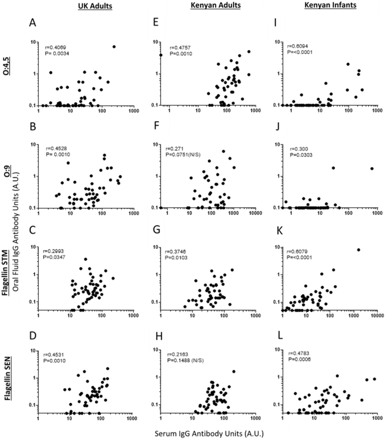 Methods: IgG and IgA antibodies specific for Salmonella Typhimurium and Salmonella Enteritidis O antigen and phase 1 flagellin were assessed using Enzyme Linked Immunosorbent Assay (ELISA). Paired oral fluid and serum samples were collected from groups of 50 UK adults, Kenyan adults and Kenyan infants. Additionally, oral fluid alone was collected from 304 Kenyan individuals across a range of ages.