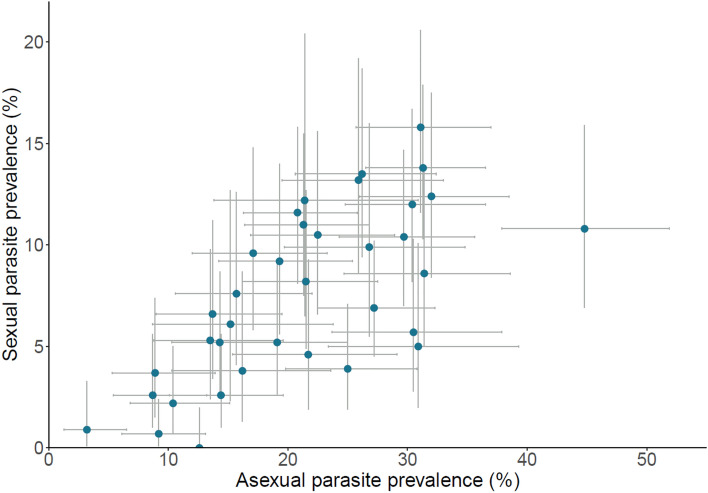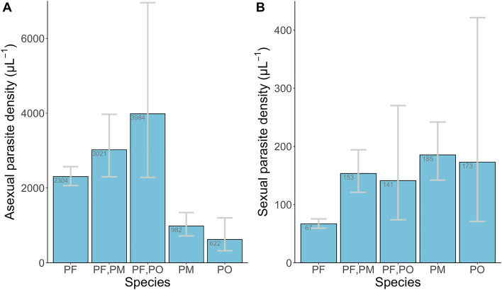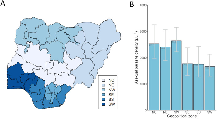 With global progress towards malaria reduction stalling, further analysis of epidemiology is required, particularly in countries with the highest burden. National surveys have mostly analysed infection prevalence, while large-scale data on parasite density and different developmental forms rarely available. In Nigeria, the country with the largest burden globally, blood slide microscopy of children up to 5 years of age was conducted in the 2018 National Demographic and Health Survey, and parasite prevalence previously reported. In the current study, malaria parasite density measurements are reported and analysed for 7783 of the children sampled across the 36 states within the six geopolitical zones of the country. Asexual and sexual stages, and infections with different malaria parasite species are analysed. Across all states of Nigeria, there was a positive correlation between mean asexual parasite density within infected individuals and prevalence of infection in the community (Spearman's rho = 0.39, P = 0.02). Asexual parasite densities were highest in the northern geopolitical zones (geometric means > 2000 μL-1), extending the evidence of exceptionally high infection burden in many areas. Sexual parasite prevalence in each state was highly correlated with asexual parasite prevalence (Spearman's rho = 0.70, P < 0.001), although sexual parasite densities were low (geometric means < 100 μL-1 in all zones). Infants had lower parasite densities than children above 1 year of age, but there were no differences between male and female children. Most infections were of P. falciparum, which had higher asexual densities but lower sexual parasite densities than P. malariae or P. ovale mono-infections. However, mixed species infections had the highest asexual parasite densities. It is recommended that future large surveys in high burden countries measure parasite densities as well as developmental stages and species, to improve the quality of malaria epidemiology and tracking of future changes.