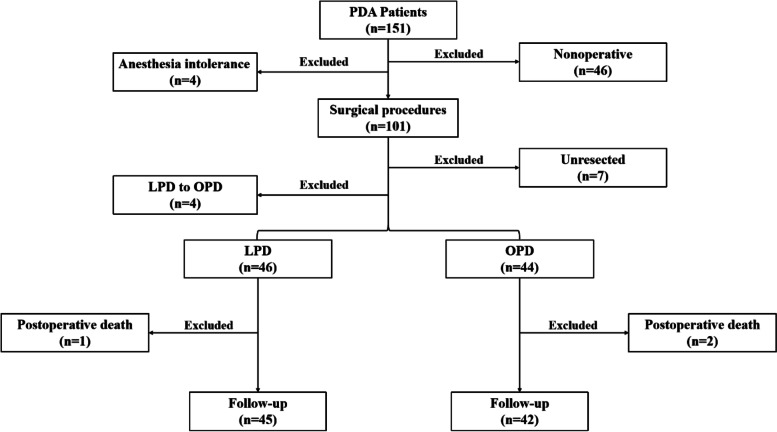 Conclusions: LPD could be efficacy and feasible for managing selected PDA patients. Also, LPD has a better effect in reducing postoperative pneumonia and abdominal infection compared to OPD.