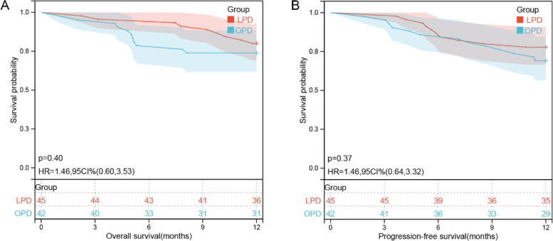 Methods: This retrospective cohort study included patients with PDA admitted at the Affiliated Hospital of Jiangnan University from October 2019 and January 2021. Patients received either LPD or OPD. Clinical outcomes (operation time, duration of anesthesia, intraoperative hemorrhage), postoperative complications, and short-term outcomes were compared. Cox proportional hazard model and Kaplan-Meier method were used to analyze overall survival (OS) and progression-free survival (PFS).