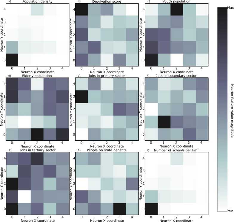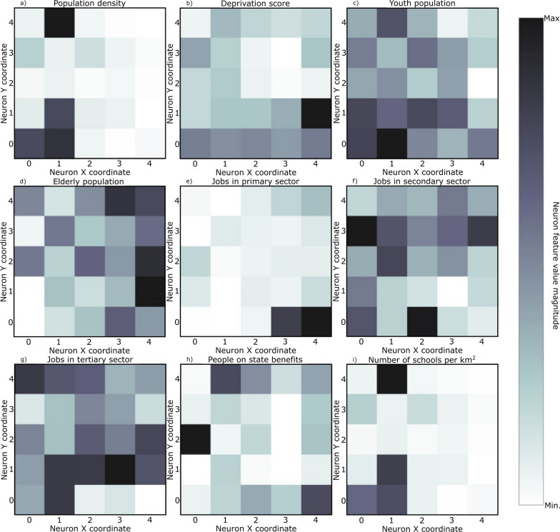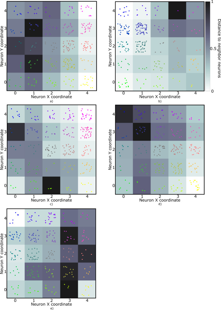 Background: Self-Organizing Maps (SOM) are an unsupervised learning clustering and dimensionality reduction algorithm capable of mapping an initial complex high-dimensional data set into a low-dimensional domain, such as a two-dimensional grid of neurons. In the reduced space, the original complex patterns and their interactions can be better visualized, interpreted and understood.