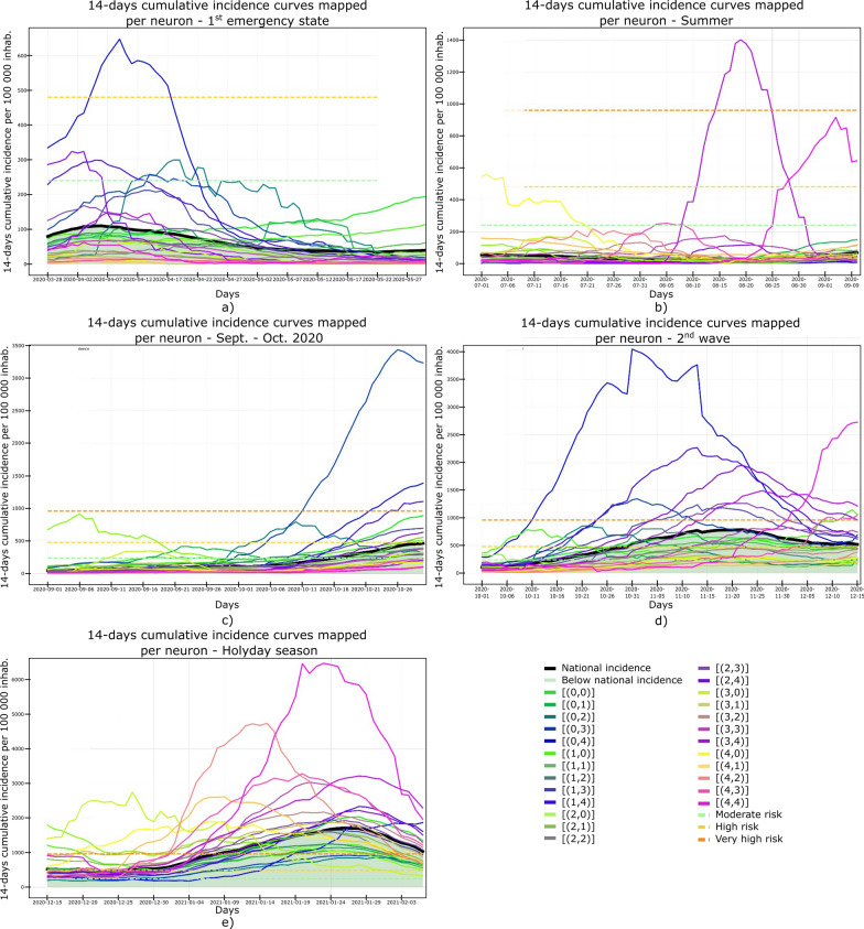 Conclusions: The results show that SOM can be an effective tool to analysing the spatiotemporal behavior of COVID-19 and synthetize the history of the disease in mainland Portugal during the period in analysis. While SOM have been applied to diverse scientific fields, the application of SOM to study the spatiotemporal evolution of COVID-19 is still limited. This work illustrates how SOM can be used to describe the spatiotemporal behavior of epidemic events. While the example shown herein uses 14-days cumulative incidence curves, the same analysis can be performed using other relevant data such as mortality data, vaccination rates or even infection rates of other disease of infectious nature.
