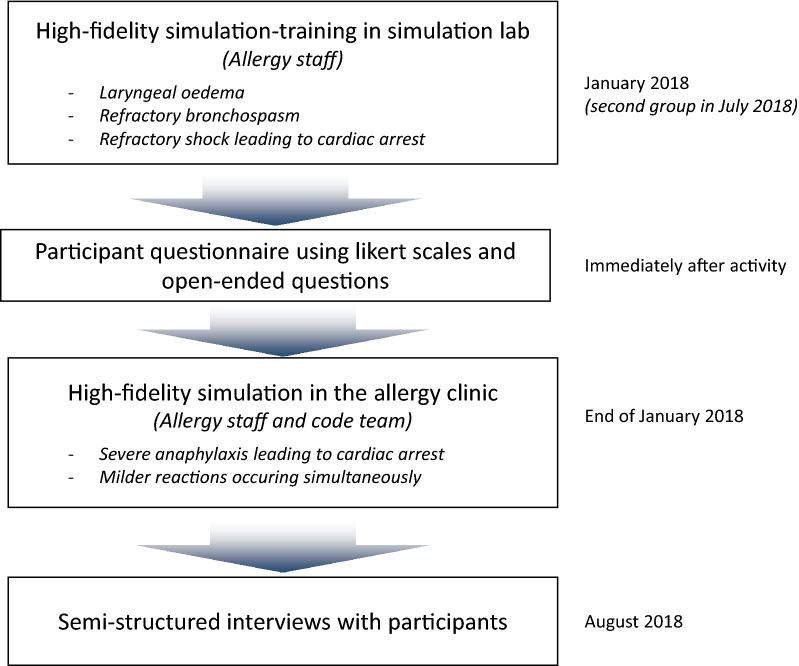 Methods: Advanced anaphylaxis scenarios were designed by a panel of emergency, intensive care unit, anesthesiology and allergy-immunology specialists and then adapted for the adult allergy clinic setting. This simulation activity included a first part in the high-fidelity simulation-training laboratory and a second at the adult allergy clinic involving actors and a high-fidelity mannequin. Participants filled out a questionnaire, and qualitative interviews were performed with staff after they had managed cases of refractory anaphylaxis.
