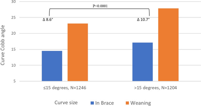 Conclusion: Curves continue to progress after brace removal and the rate and magnitude of progression are associated with the curve size at weaning, with larger curves typically exhibiting more rapid and severe progression. This analysis provides physicians and patients the ability to estimate long-term curve size based on the curve size at the time of weaning.