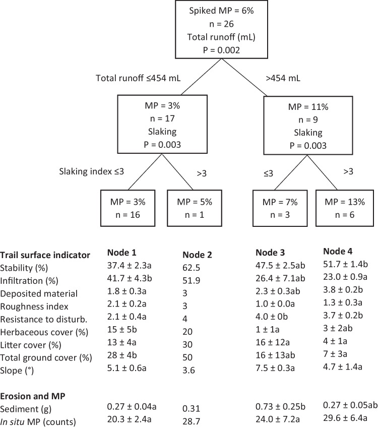 Hiking and trail running are a source of microplastic (MP) pollution on recreational trails in wilderness and conservation areas; however, the fate of MPs deposited on trails is poorly understood as MP mobility on such surfaces has not yet been examined. In this study, we simulated heavy rainfall (100 mm/h) on trail surfaces with existing MP pollution (in situ MPs) and spiked with 99 ± 2 rubber MPs (100-940 μm). Runoff was collected for 15 min and spiked and in situ MPs were quantified. Hydrological, erosional and microplastic responses were evaluated in relation to slope, bulk density, soil moisture and surface condition indicators, including amounts and types of surface cover and soil physical attributes. The MPs were largely immobile, with 85-100% of spiked MPs retained on trail surfaces. In situ MPs were detected in the trail runoff, with the majority being polyurethane, polypropylene and polyester. Microplastic movement was primarily influenced by hydrological effects, and analysis indicated the main explanatory variable was total runoff volume, followed by soil slaking. Trail sections with at least 15% herbaceous cover or a layer of loose alluvium had higher MP retention. Areas of resource accrual may be preferentially enriched, suggesting MPs from outdoor recreation may be concentrated on and adjacent to recreational trails. Microplastics deposited on trails may have long term implications for biodiversity and ecosystem functioning in wilderness and conservation areas, particularly around the trail corridor.