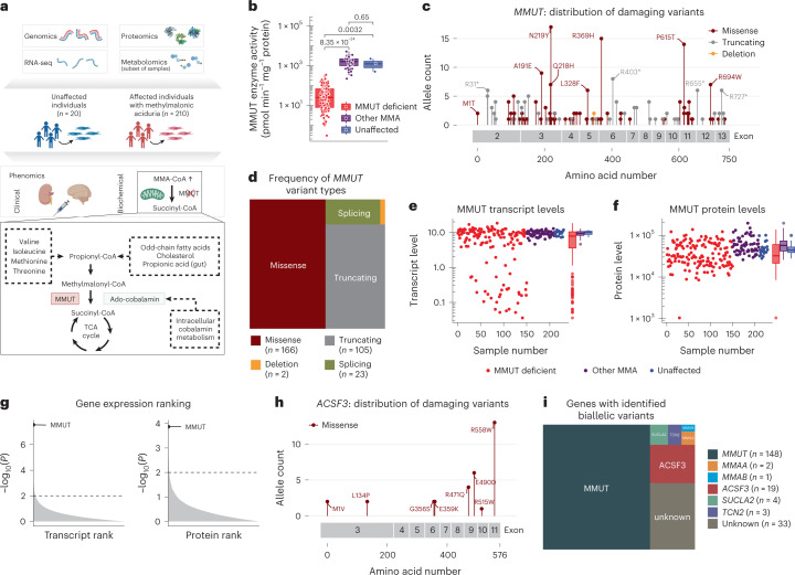 Methylmalonic aciduria (MMA) is an inborn error of metabolism with multiple monogenic causes and a poorly understood pathogenesis, leading to the absence of effective causal treatments. Here we employ multi-layered omics profiling combined with biochemical and clinical features of individuals with MMA to reveal a molecular diagnosis for 177 out of 210 (84%) cases, the majority (148) of whom display pathogenic variants in methylmalonyl-CoA mutase (MMUT). Stratification of these data layers by disease severity shows dysregulation of the tricarboxylic acid cycle and its replenishment (anaplerosis) by glutamine. The relevance of these disturbances is evidenced by multi-organ metabolomics of a hemizygous Mmut mouse model as well as through identification of physical interactions between MMUT and glutamine anaplerotic enzymes. Using stable-isotope tracing, we find that treatment with dimethyl-oxoglutarate restores deficient tricarboxylic acid cycling. Our work highlights glutamine anaplerosis as a potential therapeutic intervention point in MMA.