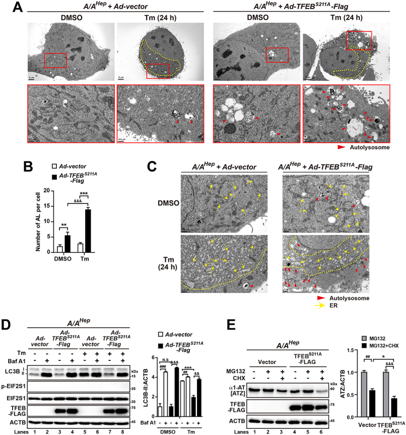 There are diverse links between macroautophagy/autophagy pathways and unfolded protein response (UPR) pathways under endoplasmic reticulum (ER) stress conditions to restore ER homeostasis. Phosphorylation of EIF2S1/eIF2α is an important mechanism that can regulate all three UPR pathways through transcriptional and translational reprogramming to maintain cellular homeostasis and overcome cellular stresses. In this study, to investigate the roles of EIF2S1 phosphorylation in regulation of autophagy during ER stress, we used EIF2S1 phosphorylation-deficient (A/A) cells in which residue 51 was mutated from serine to alanine. A/A cells exhibited defects in several steps of autophagic processes (such as autophagosome and autolysosome formation) that are regulated by the transcriptional activities of the autophagy master transcription factors TFEB and TFE3 under ER stress conditions. EIF2S1 phosphorylation was required for nuclear translocation of TFEB and TFE3 during ER stress. In addition, EIF2AK3/PERK, PPP3/calcineurin-mediated dephosphorylation of TFEB and TFE3, and YWHA/14-3-3 dissociation were required for their nuclear translocation, but were insufficient to induce their nuclear retention during ER stress. Overexpression of the activated ATF6/ATF6α form, XBP1s, and ATF4 differentially rescued defects of TFEB and TFE3 nuclear translocation in A/A cells during ER stress. Consequently, overexpression of the activated ATF6 or TFEB form more efficiently rescued autophagic defects, although XBP1s and ATF4 also displayed an ability to restore autophagy in A/A cells during ER stress. Our results suggest that EIF2S1 phosphorylation is important for autophagy and UPR pathways, to restore ER homeostasis and reveal how EIF2S1 phosphorylation connects UPR pathways to autophagy.Abbreviations: A/A: EIF2S1 phosphorylation-deficient; ACTB: actin beta; Ad-: adenovirus-; ATF6: activating transcription factor 6; ATZ: SERPINA1/α1-antitrypsin with an E342K (Z) mutation; Baf A1: bafilomycin A1; BSA: bovine serum albumin; CDK4: cyclin dependent kinase 4; CDK6: cyclin dependent kinase 6; CHX: cycloheximide; CLEAR: coordinated lysosomal expression and regulation; Co-IP: coimmunoprecipitation; CTSB: cathepsin B; CTSD: cathepsin D; CTSL: cathepsin L; DAPI: 4',6-diamidino-2-phenylindole dihydrochloride; DMEM: Dulbecco's modified Eagle's medium; DMSO: dimethyl sulfoxide; DTT: dithiothreitol; EBSS: Earle's Balanced Salt Solution; EGFP: enhanced green fluorescent protein; EIF2S1/eIF2α: eukaryotic translation initiation factor 2 subunit alpha; EIF2AK3/PERK: eukaryotic translation initiation factor 2 alpha kinase 3; ER: endoplasmic reticulum; ERAD: endoplasmic reticulum-associated degradation; ERN1/IRE1α: endoplasmic reticulum to nucleus signaling 1; FBS: fetal bovine serum; gRNA: guide RNA; GSK3B/GSK3β: glycogen synthase kinase 3 beta; HA: hemagglutinin; Hep: immortalized hepatocyte; IF: immunofluorescence; IRES: internal ribosome entry site; KO: knockout; LAMP1: lysosomal associated membrane protein 1; LMB: leptomycin B; LPS: lipopolysaccharide; MAP1LC3A/B/LC3A/B: microtubule associated protein 1 light chain 3 alpha/beta; MAP1LC3B/LC3B: microtubule associated protein 1 light chain 3 beta; MEFs: mouse embryonic fibroblasts; MFI: mean fluorescence intensity; MTORC1: mechanistic target of rapamycin kinase complex 1; NES: nuclear export signal; NFE2L2/NRF2: NFE2 like bZIP transcription factor 2; OE: overexpression; PBS: phosphate-buffered saline; PLA: proximity ligation assay; PPP3/calcineurin: protein phosphatase 3; PTM: post-translational modification; SDS: sodium dodecyl sulfate; SDS-PAGE: sodium dodecyl sulfate-polyacrylamide gel electrophoresis; SEM: standard error of the mean; TEM: transmission electron microscopy; TFE3: transcription factor E3; TFEB: transcription factor EB; TFs: transcription factors; Tg: thapsigargin; Tm: tunicamycin; UPR: unfolded protein response; WB: western blot; WT: wild-type; Xbp1s: spliced Xbp1; XPO1/CRM1: exportin 1.