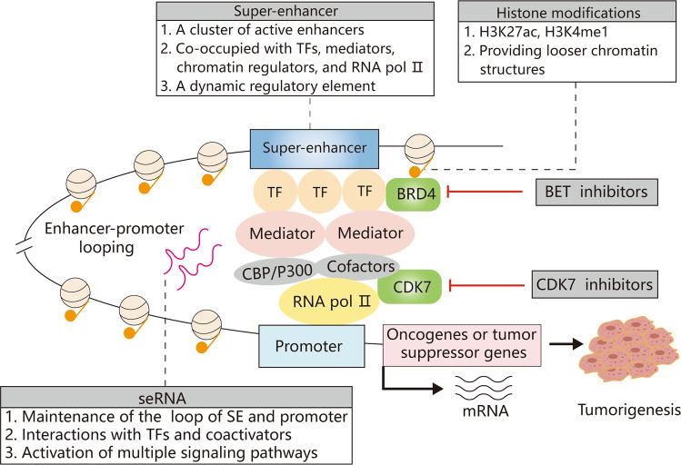 Transcriptional deregulation, a cancer cell hallmark, is driven by epigenetic abnormalities in the majority of brain tumors, including adult glioblastoma and pediatric brain tumors. Epigenetic abnormalities can activate epigenetic regulatory elements to regulate the expression of oncogenes. Superenhancers (SEs), identified as novel epigenetic regulatory elements, are clusters of enhancers with cell-type specificity that can drive the aberrant transcription of oncogenes and promote tumor initiation and progression. As gene regulators, SEs are involved in tumorigenesis in a variety of tumors, including brain tumors. SEs are susceptible to inhibition by their key components, such as bromodomain protein 4 and cyclin-dependent kinase 7, providing new opportunities for antitumor therapy. In this review, we summarized the characteristics and identification, unique organizational structures, and activation mechanisms of SEs in tumors, as well as the clinical applications related to SEs in tumor therapy and prognostication. Based on a review of the literature, we discussed the relationship between SEs and different brain tumors and potential therapeutic targets, focusing on glioblastoma.