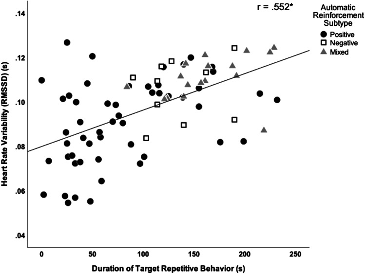Method: A single-case alternating treatment design was used to randomly alternate noncontingent low-stimulation and high-stimulation conditions in a modified functional analysis protocol. Simultaneous measurement of RRB and HRV was obtained through direct behavioral observations and a wristband that collects blood volume pulse, respectively. Visual analysis of time series data was used to determine the functional subtypes of RRB, and nonparametric correlational analyses were conducted to determine the association between HRV and RRB.