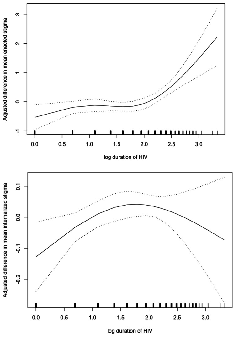 Characterizing HIV-related stigma and its impacts are important for interventions toward their elimination. A cross-sectional study was conducted in 2016 to evaluate enacted and internalized stigma among adult people living with HIV (PLWH) across four cities in Myanmar using the India Stigma Index questionnaire. Multivariable regression analyses were performed to determine differences in measured enacted and internalized stigma outcomes. Among 1,006 participants, 89% reported any stigma indicator, 47% enacted stigma, and 87% internalized stigma. In regression analysis, city and duration of illness were associated with higher enacted stigma, and younger age was associated with higher internalized stigma. Those with HIV duration > 7.4 years had mean enacted stigma nearly 2 units higher than the overall mean. Internalized stigma increased with duration of illness and leveled off at 5 years. PLWH from smaller cities experienced lower stigma. In Myanmar, nearly 90% of PLWH experience stigma, results that reflect a unique transition point.