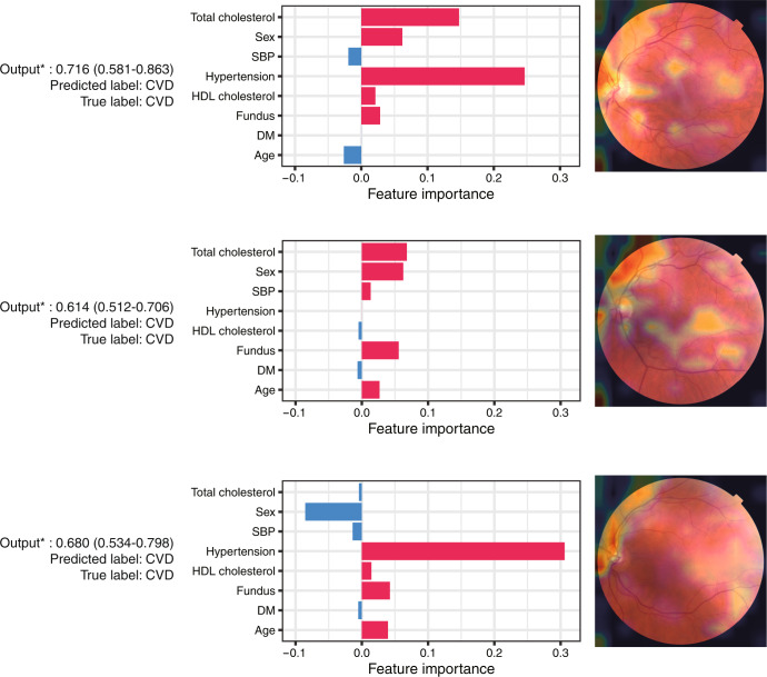 Cardiovascular disease (CVD), the leading cause of death globally, is associated with complicated underlying risk factors. We develop an artificial intelligence model to identify CVD using multimodal data, including clinical risk factors and fundus photographs from the Samsung Medical Center (SMC) for development and internal validation and from the UK Biobank for external validation. The multimodal model achieves an area under the receiver operating characteristic curve (AUROC) of 0.781 (95% confidence interval [CI] 0.766-0.798) in the SMC and 0.872 (95% CI 0.857-0.886) in the UK Biobank. We further observe a significant association between the incidence of CVD and the predicted risk from at-risk patients in the UK Biobank (hazard ratio [HR] 6.28, 95% CI 4.72-8.34). We visualize the importance of individual features in photography and traditional risk factors. The results highlight that non-invasive fundus photography can be a possible predictive marker for CVD.