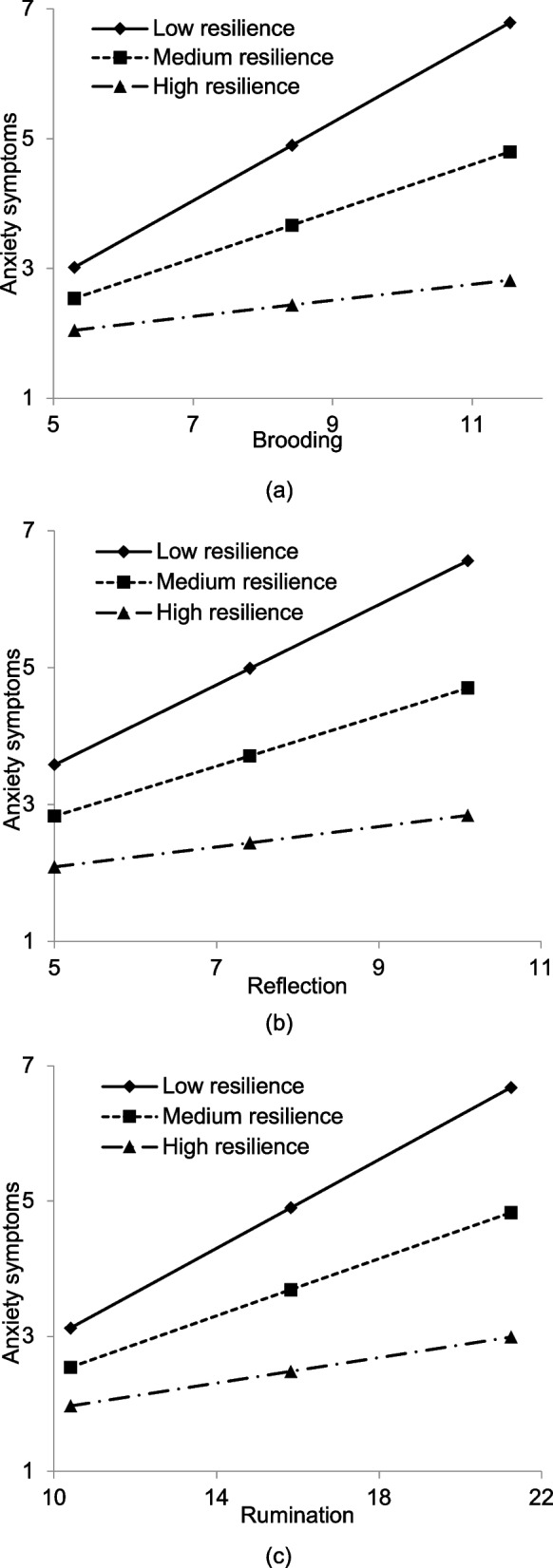 Results: The roles of anxiety symptoms in accounting for the positive associations of brooding, reflection and rumination with poor sleep quality were revealed. It was found that there was a significant moderating role of resilience on the positive associations of brooding, reflection and rumination with anxiety symptoms, which were gradually reduced as resilience increased. The direct associations between brooding, reflection and rumination and poor sleep quality were not significantly moderated by resilience. Thus, a moderated mediation model involving anxiety symptoms and resilience for explaining the impact of rumination on poor sleep quality was supported among patients with NAFLD.