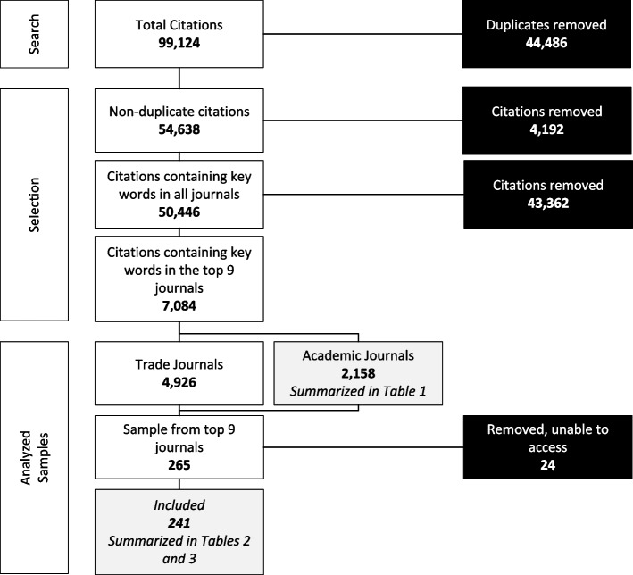 Results: The initial search yielded 99,124 citations, leaving 54,638 after removing duplicates and 7084 relevant articles from nine journals after ranking. Subsequently, 2058 articles were included for topic categorization, and 241 papers were included for full text analysis after random sampling. Overall, this literature reveals: 1) a relatively narrow topic focus, given the majority of research has concentrated on general operational activities and specific clinical conditions and interventions (e.g., resuscitation, airway management, etc.); 2) a limited methodological (and possibly philosophical) focus, given that most were observational studies (e.g., cohort, case control, and case series) or editorial/commentary; 3) a variety of observed trajectories of academic attention, indicating where the evolution of paramedicine is evident, areas where scope of practice is uncertain, and areas that aim to improve skills historically considered core to paramedic clinical practice.