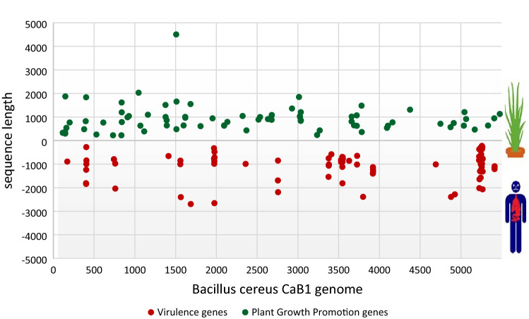 In the study, a previously isolated plant beneficial endophytic B. cereus CaB1 was selected for the detailed analysis by whole-genome sequencing. The WGS has generated a total of 1.9 GB high-quality data which was assembled into a 5,257,162 bp genome with G + C content of 35.2%. Interestingly, CaB1 genome was identified to have 40 genes with plant beneficial functions by bioinformatic analysis. At the same time, it also showed the presence of various virulence factors except the diarrhoeal toxin, cereulide. Upon comparative analysis of CaB1 with other B. cereus strains, it was found to have random distributions of virulence and plant growth promoting traits. The core genome phylogenetic analysis of the Bacillus cereus strains further showed the close relation of plant associated strains with isolates from spoiled food products. The observed genome flexibility of B. cereus thus indicates its ability to make use of diverse hosts, which can result either in beneficial or harmful effects.