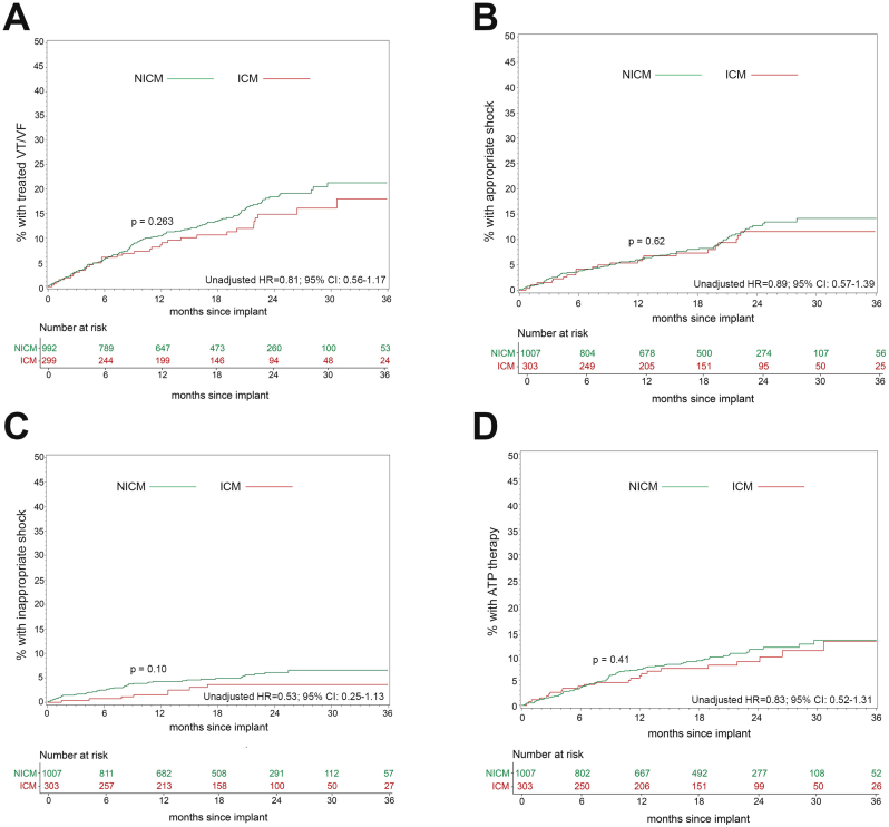 Results: Of 1848 PP NICM patients, 1007 (54.5%) received ICD/CRT-D, while 303 of 581 (52.1%) PP ICM patients received an ICD/CRT-D. The all-cause mortality rate at 3 years for NICM patients with and without an ICD/CRT-D was 13.1% and 18.3%, respectively (HR 0.51, 95% CI 0.38-0.68, p < 0.001). Similarly, all-cause mortality at 3 years in ICM patients was 13.8% in those with a device and 19.9% in those without an ICD/CRT-D (HR 0.54, 95% CI 0.33-.0.88, p = 0.011). The time to first device therapy, time to first shock, and time to first antitachycardia pacing (ATP) therapy were not significantly different between groups (p ≥ 0.263).