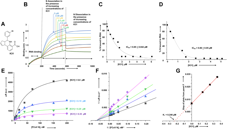 Feline infectious peritonitis (FIP) is a serious viral illness in cats, caused by feline coronavirus. Once a cat develops clinical FIP, the prognosis is poor. The effective treatment strategy for coronavirus infections with immunopathological complications such as SARS-CoV-2, MERS, and FIP is focused on antiviral and immunomodulatory agents to inhibit virus replication and enhance the protective immune response. In this article we report the binding and conformational alteration of feline alphacoronavirus (FCoV) nucleocapsid protein by a novel compound K31. K31 noncompetitively inhibited the interaction between the purified nucleocapsid protein and the synthetic 5' terminus of viral genomic RNA in vitro. K31 was well tolerated by cells and inhibited FCoV replication in cell culture with a selective index of 115. A single dose of K31inhibited FCoV replication to an undetectable level in 24 h post treatment. K31 did not affect the virus entry to the host cell but inhibited the postentry steps of virus replication. The nucleocapsid protein forms ribonucleocapsid in association with the viral genomic RNA that serves as a template for transcription and replication of the viral genome. Our results show that K31 treatment disrupted the structural integrity of ribonucleocapsid in virus-infected cells. After the COVID-19 pandemic, most of the antiviral drug development strategies have focused on RdRp and proteases encoded by the viral genome. Our results have shown that nucleocapsid protein is a druggable target for anticoronavirus drug discovery.