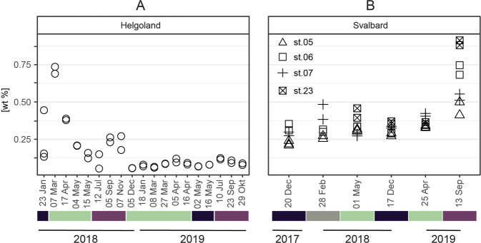 Coastal sands are biocatalytic filters for dissolved and particulate organic matter of marine and terrestrial origin, thus, acting as centers of organic matter transformation. At high temporal resolution, we accessed the variability of benthic bacterial communities over two annual cycles at Helgoland (North Sea), and compared it with seasonality of communities in Isfjorden (Svalbard, 78°N) sediments, where primary production does not occur during winter. Benthic community structure remained stable in both, temperate and polar sediments on the level of cell counts and 16S rRNA-based taxonomy. Actinobacteriota of uncultured Actinomarinales and Microtrichales were a major group, with 8 ± 1% of total reads (Helgoland) and 31 ± 6% (Svalbard). Their high activity (frequency of dividing cells 28%) and in situ cell numbers of >10% of total microbes in Svalbard sediments, suggest Actinomarinales and Microtrichales as key heterotrophs for carbon mineralization. Even though Helgoland and Svalbard sampling sites showed no phytodetritus-driven changes of the benthic bacterial community structure, they harbored significantly different communities (p < 0.0001, r = 0.963). The temporal stability of benthic bacterial communities is in stark contrast to the dynamic succession typical of coastal waters, suggesting that pelagic and benthic bacterial communities respond to phytoplankton productivity very differently.
